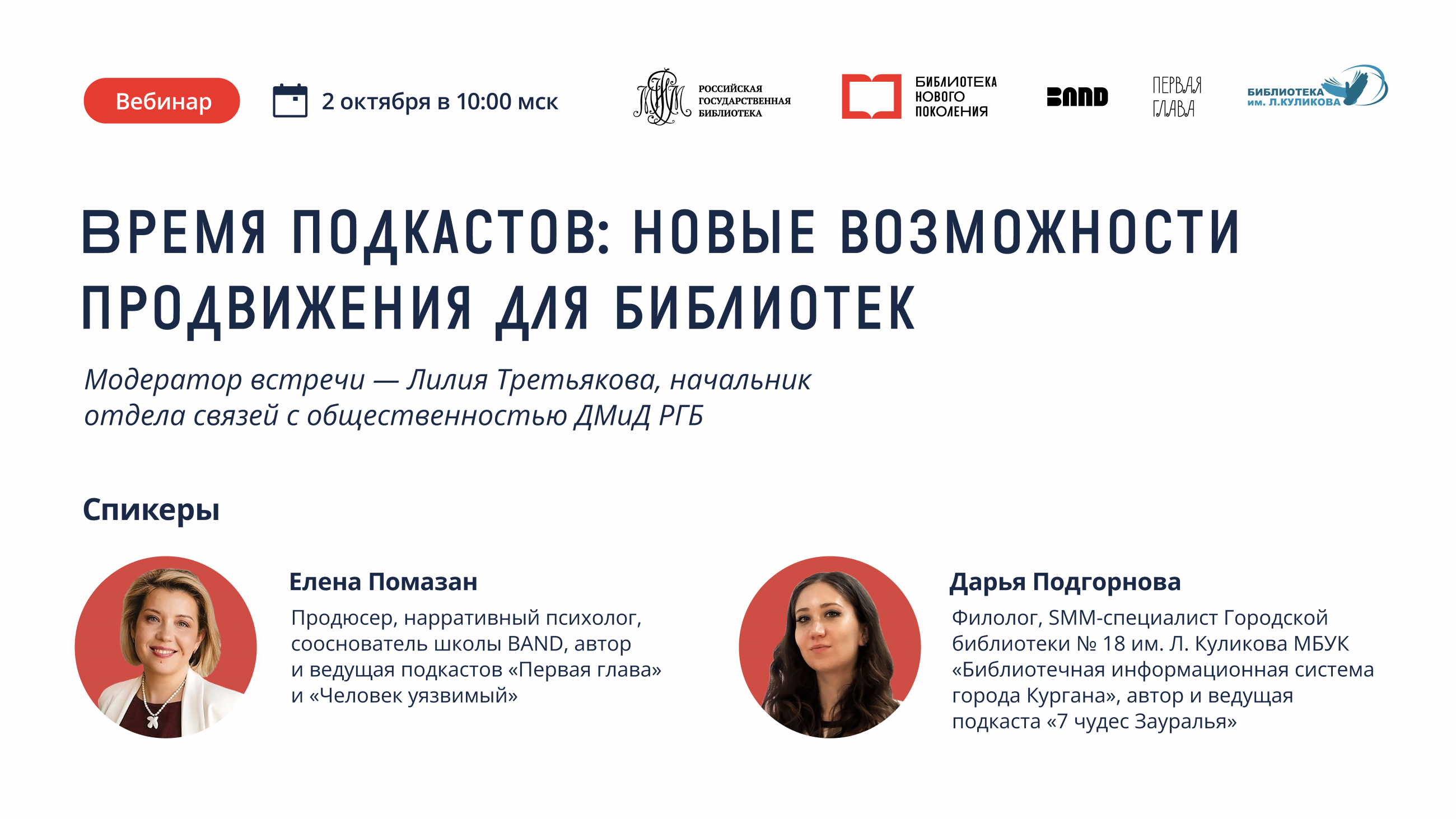 Проектный офис Российской государственной библиотеки приглашает зрителей погрузиться в сферу подкастинга. Эта индустрия по созданию и распространению аудио- или видеоконтента сегодня является востребованной и стремительно развивается. За последние несколько лет такой медиаформат превратился в постоянный объект внимания слушателей в разных регионах России. Подкасты способствуют объединению местных сообществ, популяризации локальной идентичности и повышению социальной активности. Приглашенные эксперты подробно расскажут об этом современном формате и о том, как он может быть полезен учреждениям культуры. Также всех зрителей вебинара ждет сюрприз, о котором будет рассказано во время прямого эфира.